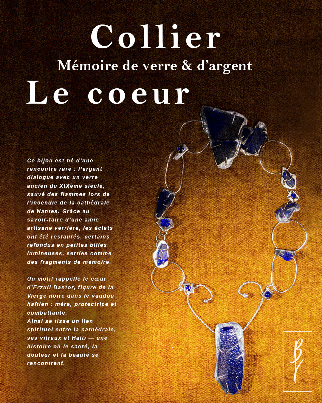 Ce bijou est né d’une rencontre rare : l’argent dialogue avec un verre ancien du XIXème siècle, sauvé des flammes lors de l’incendie de la cathédrale de Nantes.