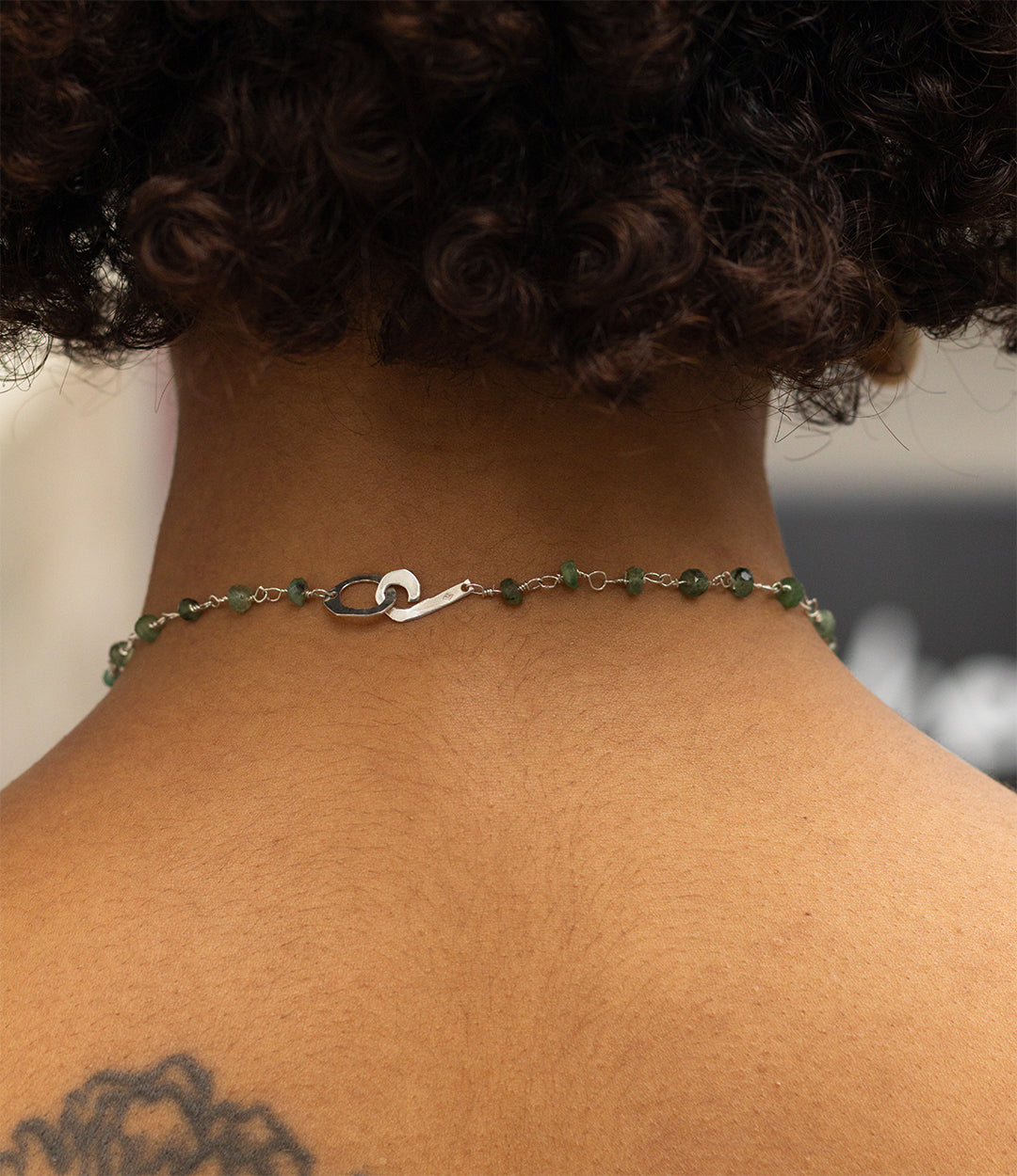 Ce bijou associe l’argent, les perles enfilées une à une à la main, et la préhnite, pierre aux reflets doux et lumineux.